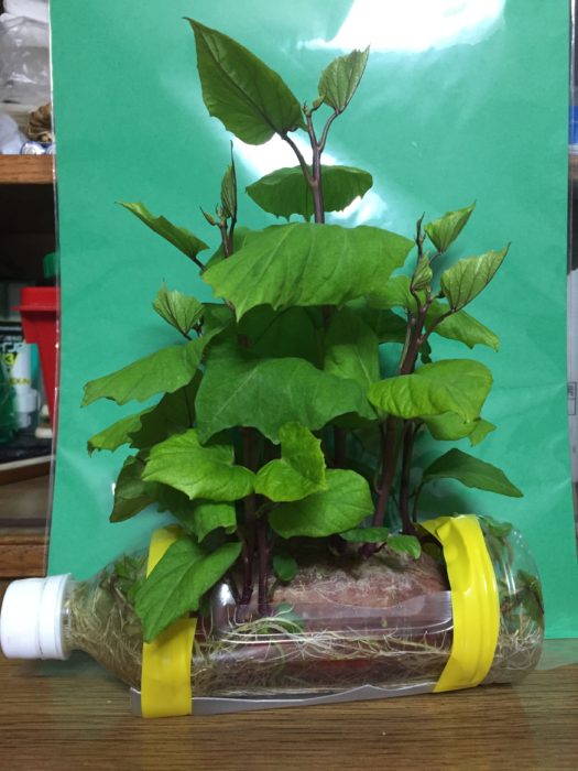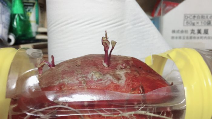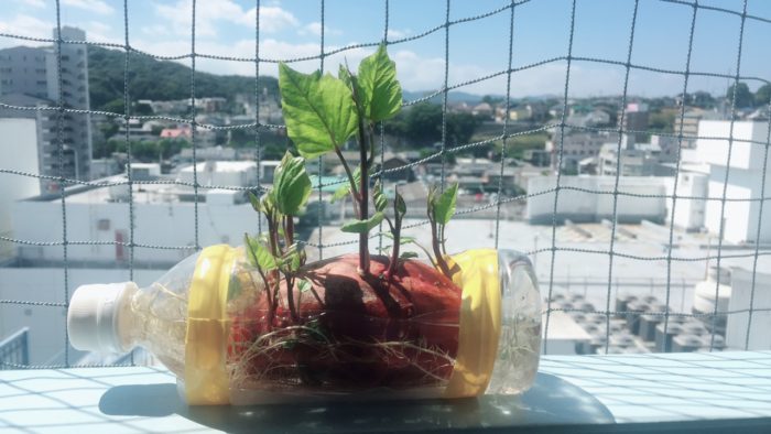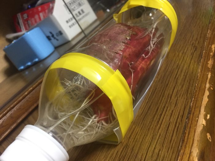 旅先で見たさつまいもの水耕栽培をまねてみました。ペットボトルをカッターナイフで芋が入る大きさに穴を空け、後は芋を中に入れて水を注ぐだけです。